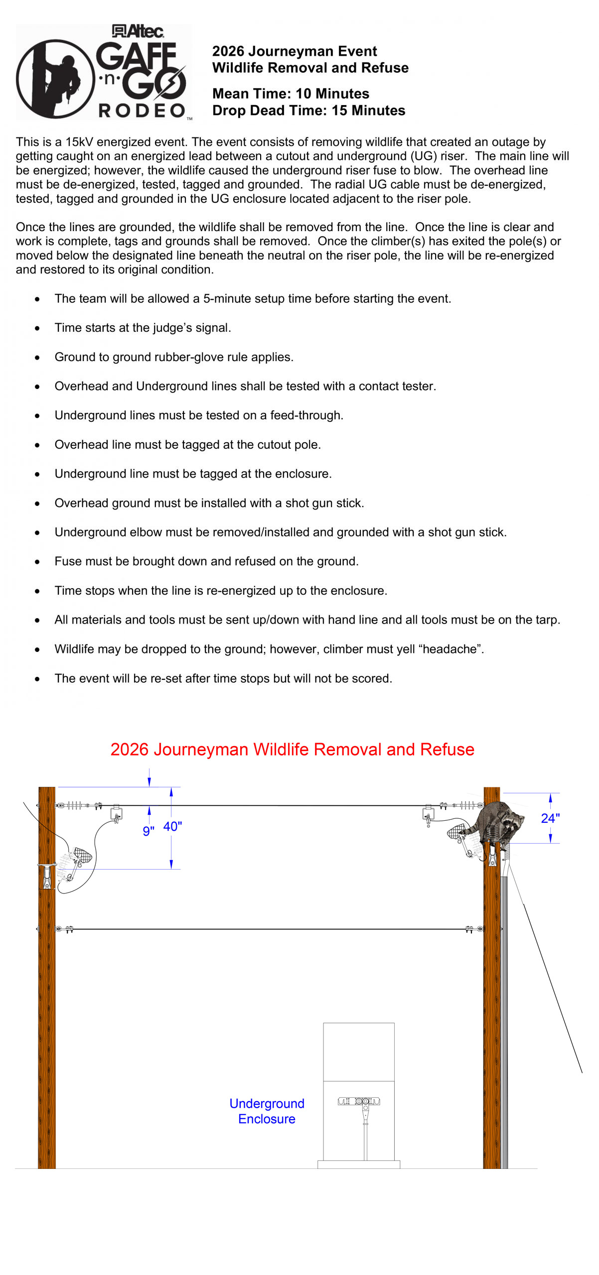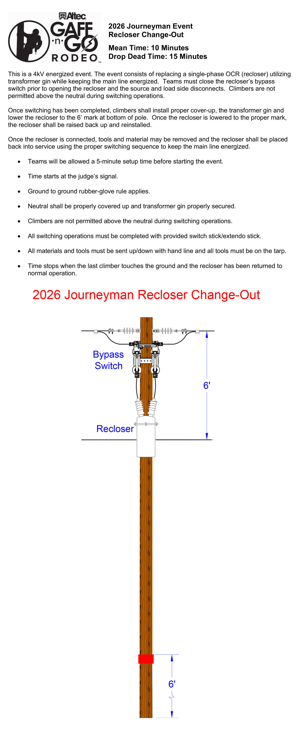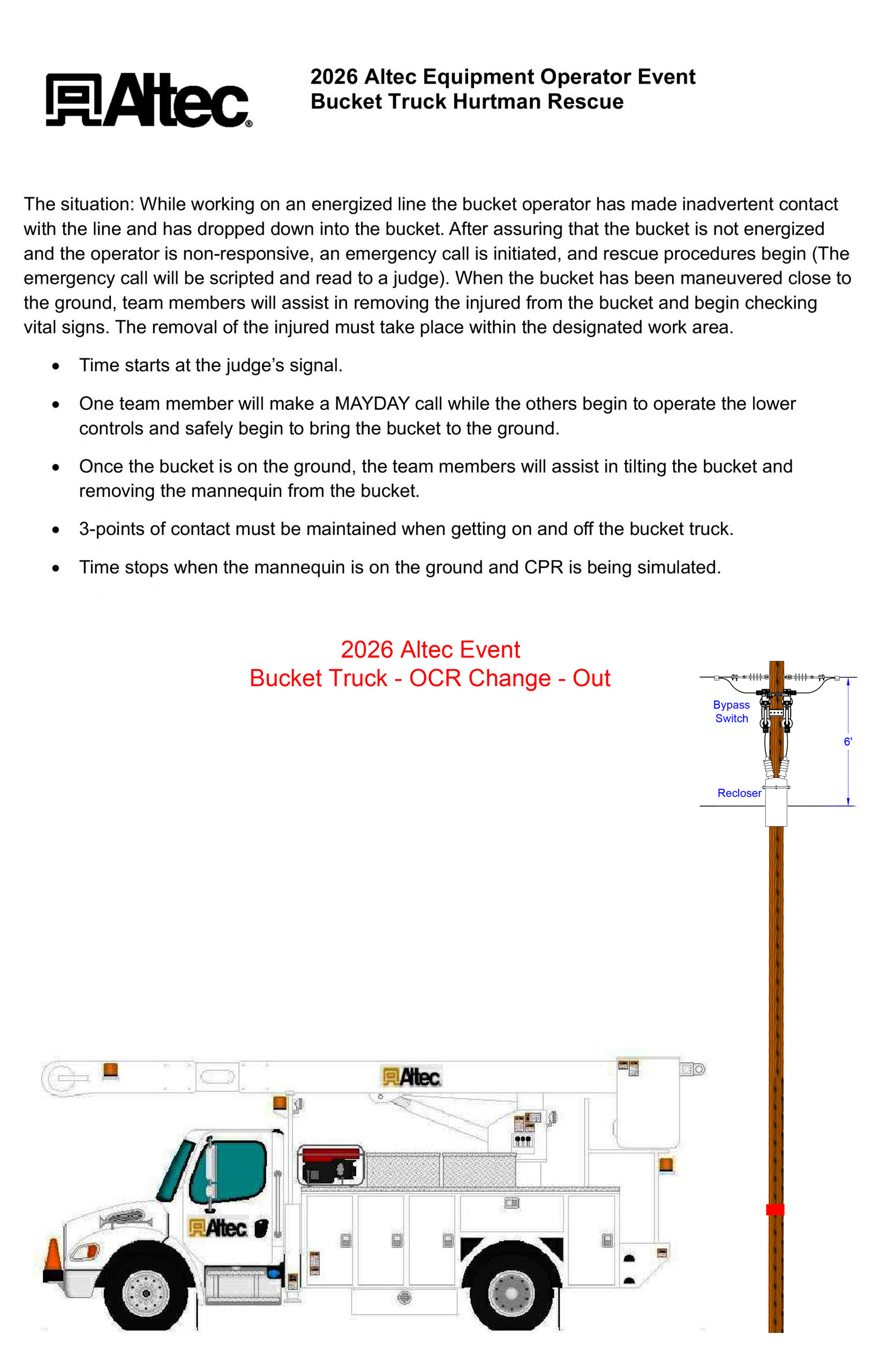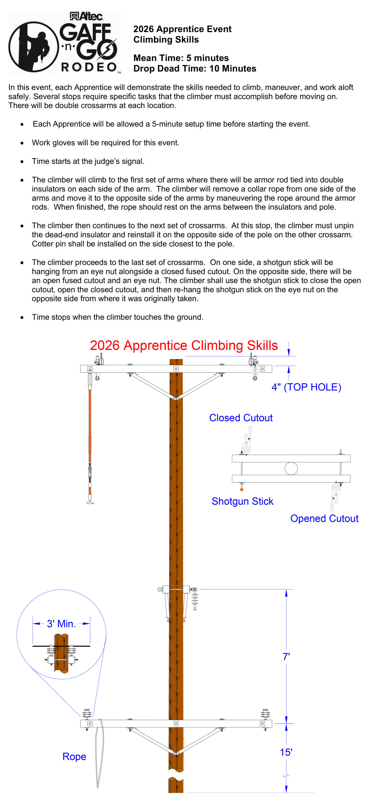 The Digger Derrick/ Mini Excavator Obstacle Course is designed to evaluate equipment operators on precision, control, coordination, and safe work practices while maneuvering heavy equipment and loads through courses marked with cones.  For this event, a Mini Excavator and a Digger Derrick will be positioned directly across from one another with each piece of equipment in a designated location.  Each piece of equipment will have its own course and objective that must be completed.